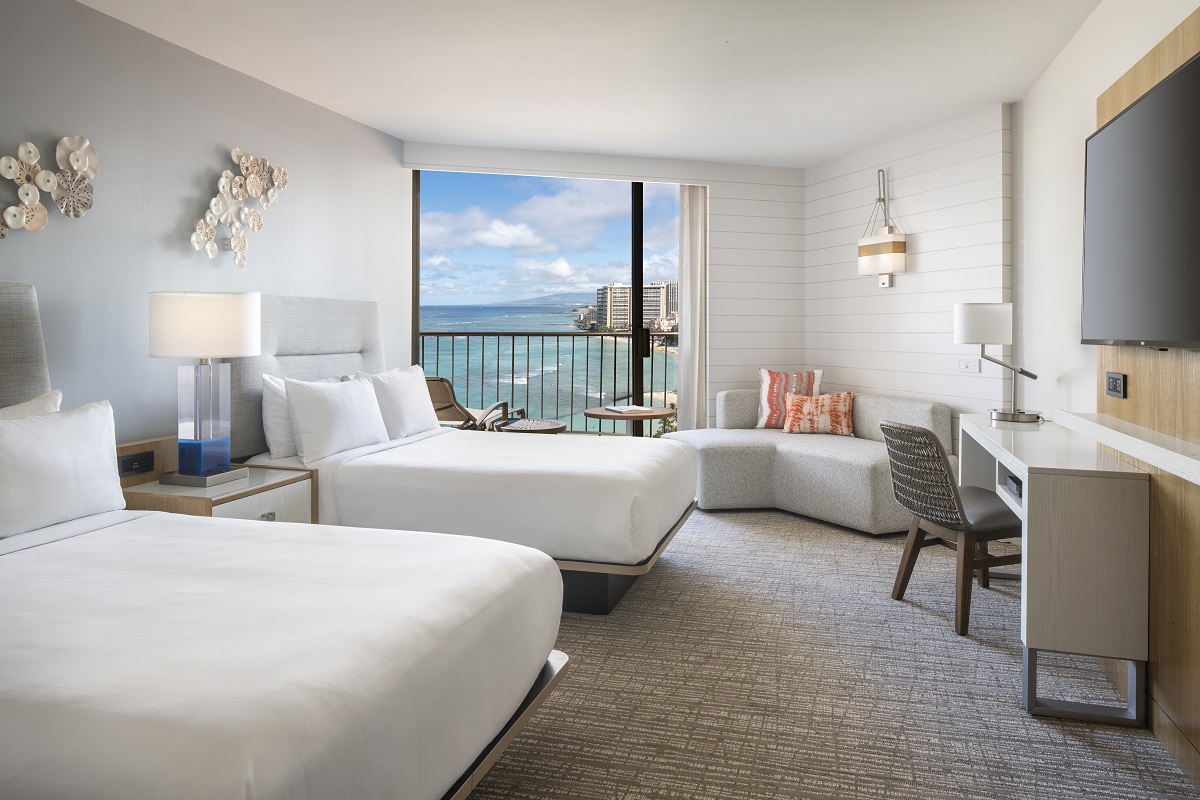 パオアカラニタワーとケアロヒラニタワーの2つのタワーがあり、シティビューからオーシャンフロントまで多彩な客室をご用意。サンゴのモチーフがアクセントの客室内は淡い色で統一され、落ち着いた雰囲気となっています。