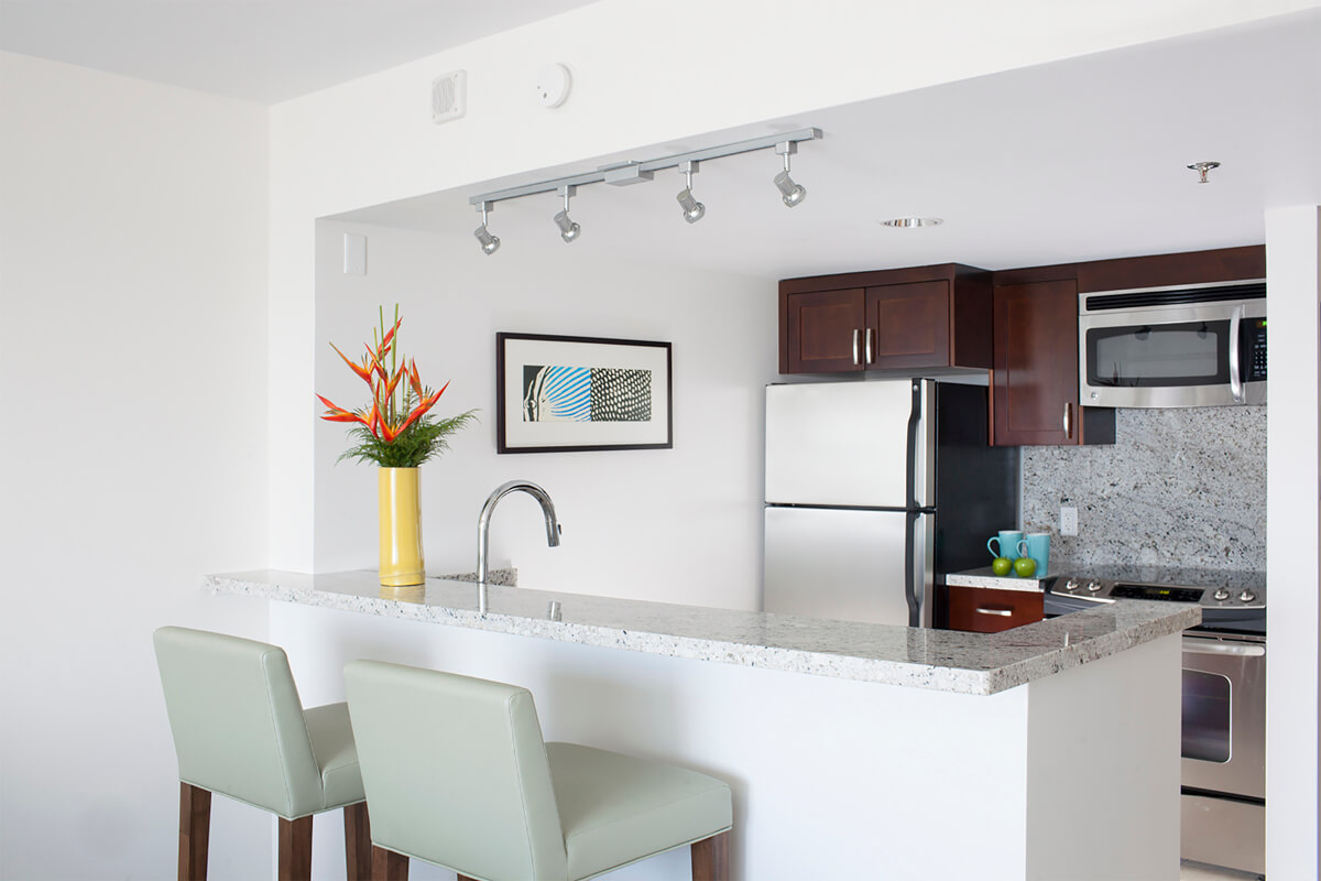 ラグジュアリー・ジュニア・スイートタイプ、ラグジュアリー・2ベッドルームタイプのどちらの客室タイプもフルキッチンが完備されています。4口コンロや炊飯器、オーブンまでも備わっているので、長期滞在でも快適にお過ごしいただけます。ファーマーズマーケットや地元のスーパーで食材を買ってきて、お部屋で料理を楽しむのもハワイ滞在の醍醐味。